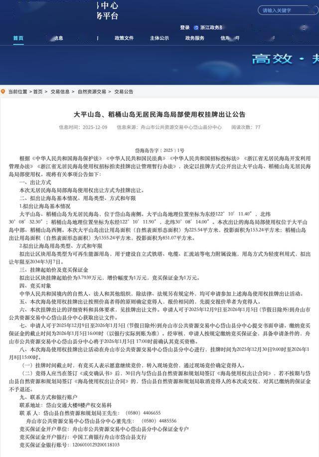 依照舟山市大众资源买卖中央岱山县分中央的布告,此次出让的是两座海岛的个别应用权,而非团体扫数权。的确而言: